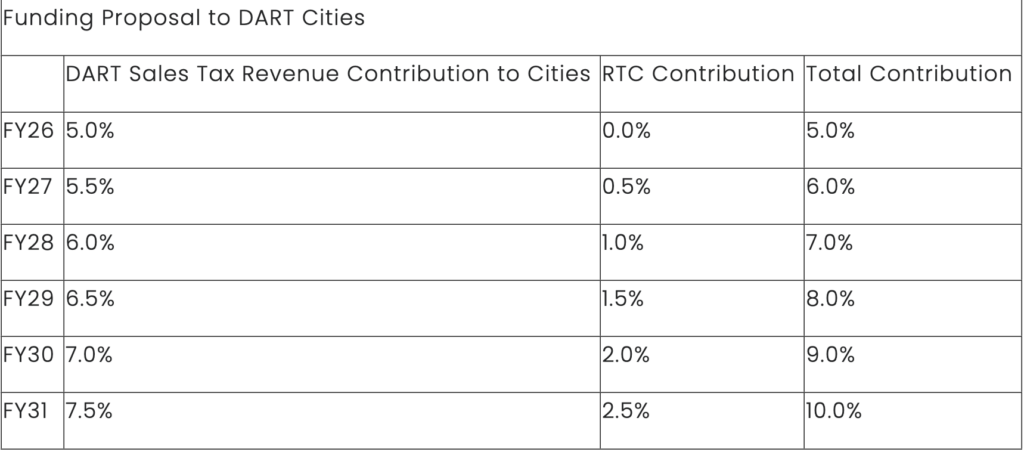 DART reported that the agreement also creates a list of funding priorities that DART, member cities, and regional partners would work to advance at the state level. These items would include the governance structure along with: finding additional non-tax-based funding and transferring management of commuter rail (Trinity Railway Express and Silver Line) to a regional transportation authority, and finding additional non-tax-based funding.