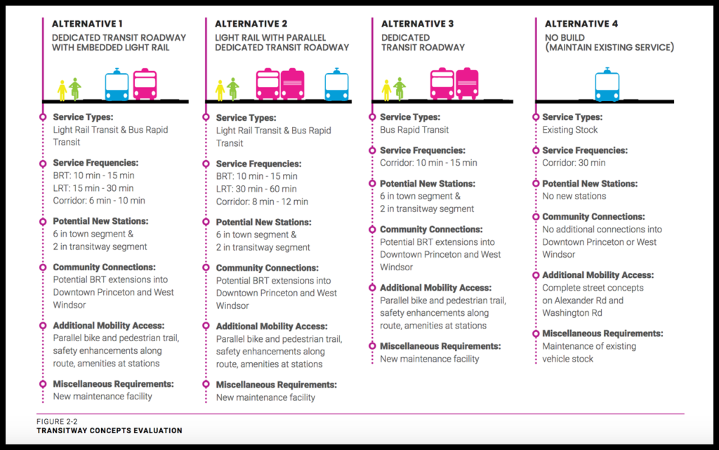 According to the study, “Alternative 1 would substantially enhance mobility and access to transit in Princeton and West Windsor, increase ridership, enhance active modes, and would minimize negative impacts to ROW [right-of-way], the environment, and historical and cultural resources.”