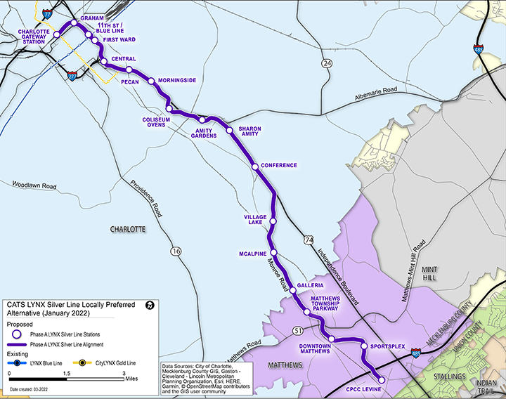 Key stops, as part of the Lynx Silver Line, are expected to include the Bank of America Stadium, Charlotte Douglas International Airport, Bojangles Coliseum and the Town of Matthews.