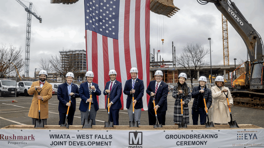WMATA along with development partners Rushmark Properties and EYA, LLC, and Virginia elected officials on Nov. 19 broke ground on a dense, mixed-use community, just steps from the West Falls Church Metrorail Station.