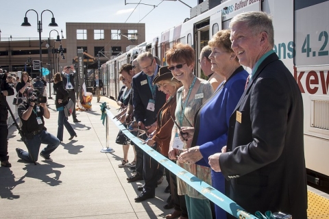 What began with a ceremonial “pulling” of the old Associated Railroad trolley tracks in May 2007 in Lakewood, evolved into the 12.1-mile connection from Golden in Jefferson County through Lakewood to Denver. The line, RTD says, was the first to open of the FasTracks expansion in 2013. The celebration kicked-off with the RTD Color Guard and the Colorado School of Mines Marching Band and a performance by the Ambassadors of Gospel. Thousands of people waited to take the first ride on that sunny spring day.