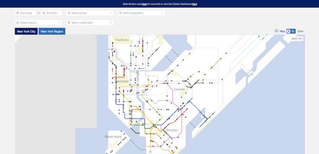 - “A new ‘Transit Service’ view. This simplifies finding a project by grouping infrastructure projects by the transit routes they affect and a redesigned map that clearly shows where work is happening across the system. Users can click on a specific line to see the multiple projects that have been completed, underway, and planned across the entire route—ranging from accessibility upgrades, Communications-Based Train Control (CBTC) installation, state-of-good-repair work and other station upgrades.