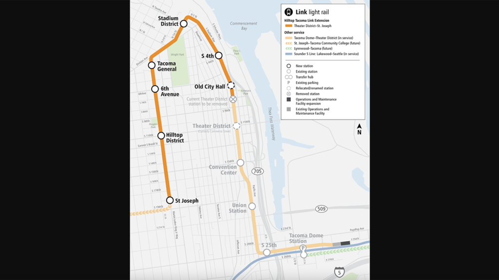 With civil construction now complete for the 2.4-mile Hilltop Tacoma Link Extension (see map above), Sound Transit on July 13 reported that light-rail test trains will begin running on the entire length of the T Line from Tacoma Dome to the Hilltop District. The extension project doubles the length of the T Line, and includes one relocated station, six new stations, and an expansion of the Operations and Maintenance Facility in Tacoma to accommodate five new light rail vehicles. Sound Transit expects a late summer launch, with a projected ridership of 2,000-4,000 daily riders by 2026.