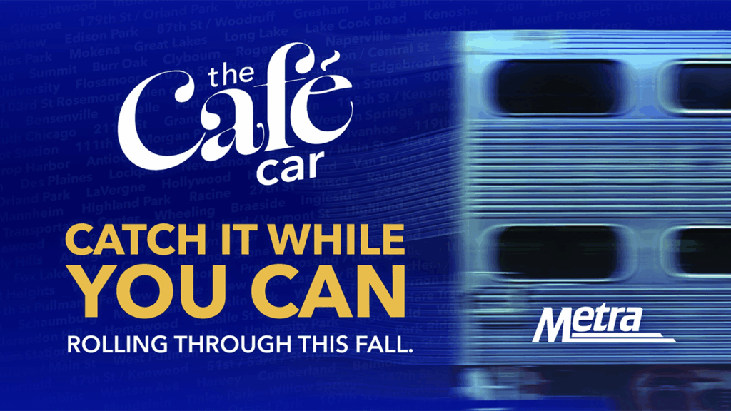 The car will be moved to the BNSF Line the week of Oct. 13, the Milwaukee District North Line the week of Oct. 20, the Milwaukee District West Line the week of Oct. 27, the Union Pacific North Line the week of Nov. 3, the Union Pacific Northwest Line the week of Nov. 10, and the Union Pacific West Line the week of Nov. 17. The specific schedule for each line will be posted at metra.com/CafeCar