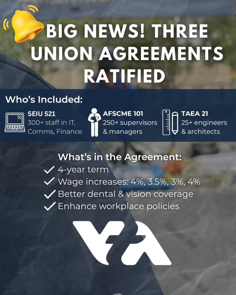 Service Employees International Union (SEIU) Local 521; American Federation of State, County, and Municipal Employees (AFSCME) Local 1101; and Transportation Authority Engineers and Architects (TAEA) Local 21, which represent about 575 workers combined, reached agreements with VTA as of April 17. The terms include a 14.5% wage increase over the next four years, better dental and vision coverage and “improved” workplace policies, according to a VTA statement.