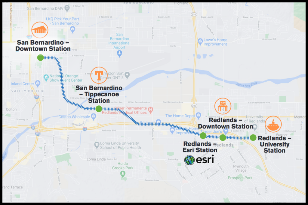 The $359.7 million project was initiated by SBCTA and Metrolink in 2014, and will link the San Bernardino Transit Center (located at Rialto Avenue and E Street in downtown San Bernardino adjacent to San Manuel Stadium) and the University of Redlands (see map below).