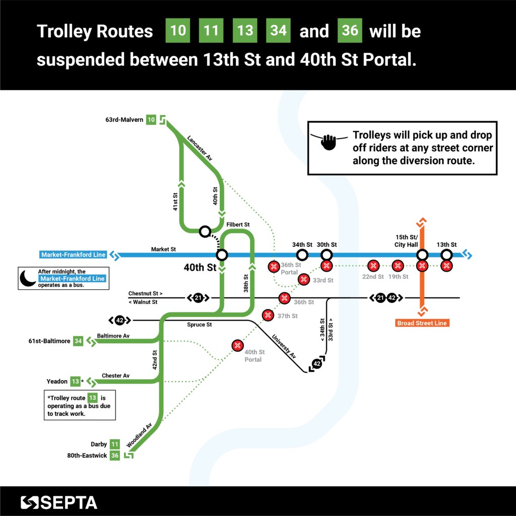 SEPTA Trolley Routes 10, 11, 13, 34 and 36 will not operate in the Center City tunnel from 10 p.m. on Friday, July 7 through 5 a.m. on Monday, July 24.
