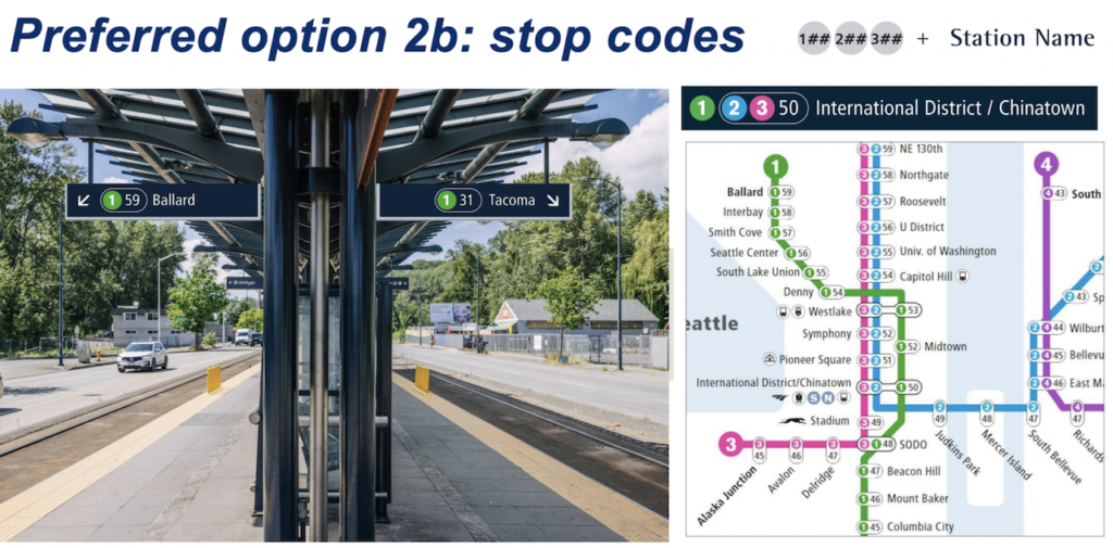 Sound Transit, The Urbanist reports, will keep universal icons in its media and signage like airplanes and ferries for airports and ferry terminal connections, adding that Sound Transit’s preferred approach is Option 2B, a bubble system that gives each station one to three stop codes.