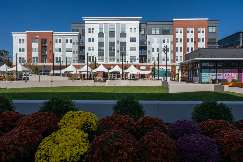 Station Yards is taking shape in phases around one of Long Island’s key transportation hubs. Upon completion, it will encompass 1,450 residential units, 360,000 square feet of office space, and 195,000 square feet of retail space. The first phase, Alston Station Yards, delivered 489 residential units in 2020. The second phase, The Core, will introduce an additional 388 homes, expand retail and office spaces by 67,000 and 16,500 square feet respectively, and feature a public plaza alongside more than 1,200 parking spaces.