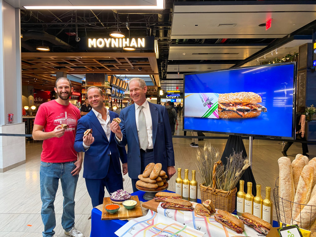 MTA Chair and CEO Janno Lieber (right), Alidoro Owner/CEO Jon Streep, and third-generation owner of Katz’s Jake Dell on Sept. 29 announced the launch of the limited-edition 1904 Sandwich in celebration of New York City Transit subway’s 118th anniversary, Oct. 27, 1904. (Jessie Mislavsky/MTA)