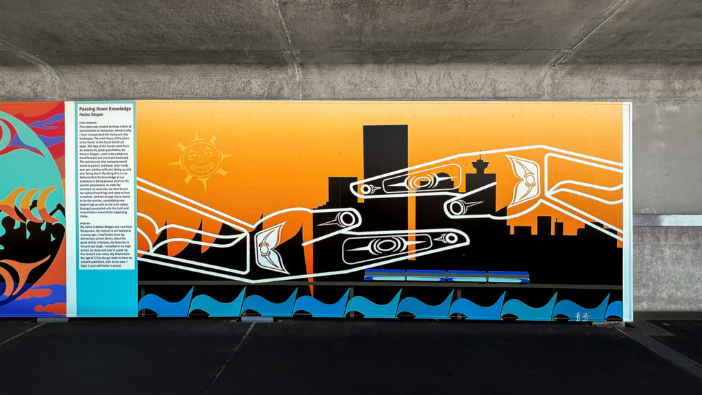 As part of Transport 2050, TransLink said it teamed with xʷməθkʷəy̓əm to put out a call for Indigenous art “to celebrate the future of transportation.” Three xʷməθkʷəy̓əm artists were selected: Mack Paul, Diamond Point, and Hailee Stogan. Each artist created an original digital mural, roughly 17-feet long and seven-feet high, “reflecting the past, present and future of the region, through the lens of colonialism and reconciliation,” TransLink reported. “Reconciliation is a priority at TransLink and a key part of its regional transportation strategy.”