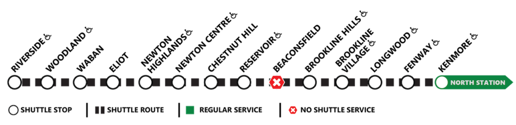 Alternative service will be available for all D Branch riders throughout the closures. Free, accessible shuttle buses will stop at stations between Riverside and Kenmore. Shuttle buses will not stop at Beaconsfield station due to narrow roads in the area. Riders can use Reservoir station, or Dean Road on the C Branch to access the Green Line.