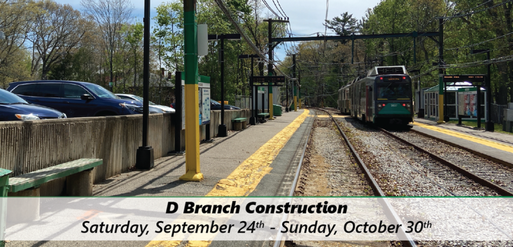 The MBTA recently announced that beginning Saturday, Sept. 24, the Green Line D Branch will close for three nine-day, full-access closures, which will take place on a rolling basis through Sunday, Oct. 30, to replace track, station crossings and wayside equipment installations for the Green Line Train Protection System (GLTPS).