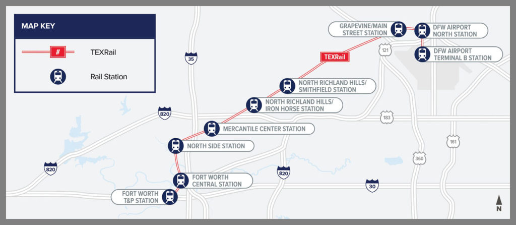 Trinity Metro owns and operates the 27-mile TEXRAIL line, which debuted in January 2019 and celebrated its fourth anniversary earlier this year. TEXRAIL runs from downtown Fort Worth, across northeast Tarrant County, through North Richland Hills and Grapevine, and into Dallas Fort Worth International Airport’s Terminal B. It serves seven stations and connects with the Dallas-Fort Worth Trinity Railway Express (TRE) commuter line at the Fort Worth T&P and Fort Worth Central stations. Trinity Metro and Dallas Area Rapid Transit (DART) jointly own and operate the 34-mile TRE.