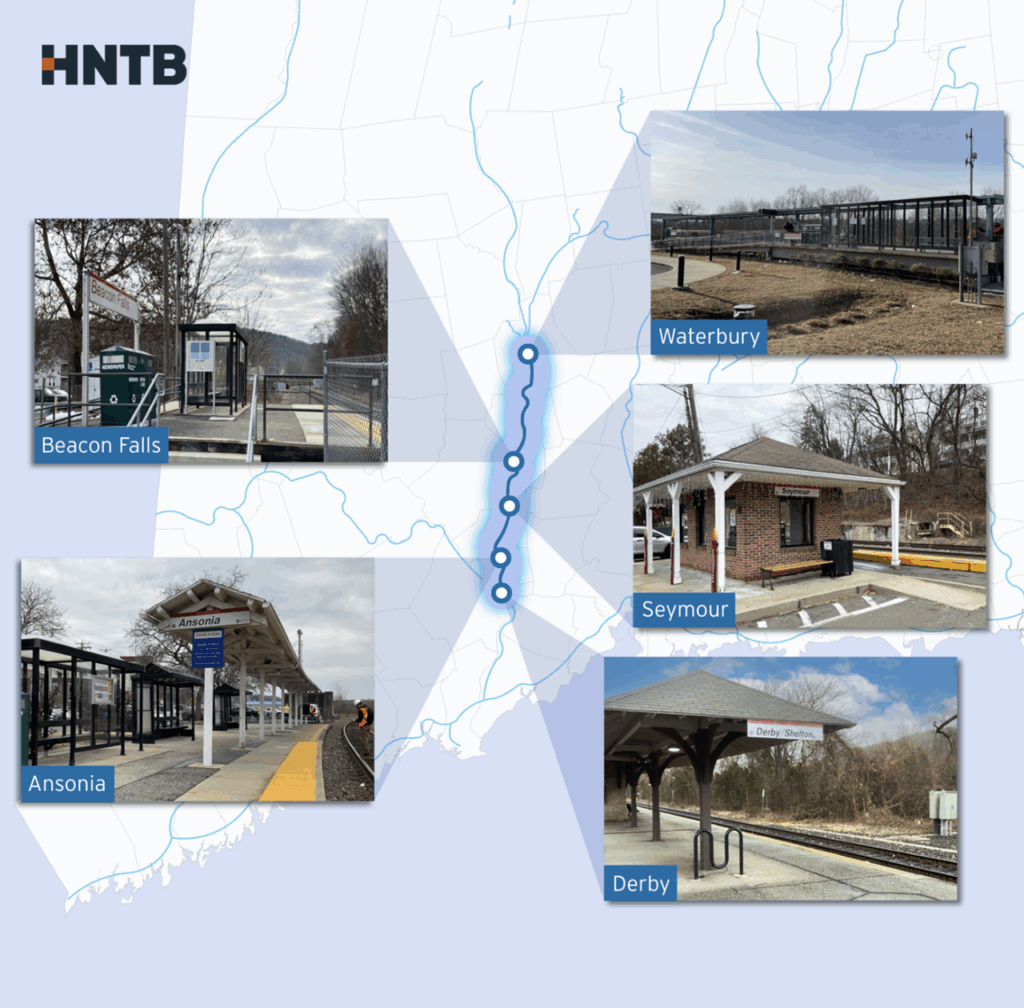 HNTB on June 23 reported landing a construction engineering and inspection (CEI) services contract from CTDOT for a series of station improvements along the Waterbury Branch Line, a 28.5-mile segment of Metro-North Railroad’s New Haven Line serving the Naugatuck River Valley.