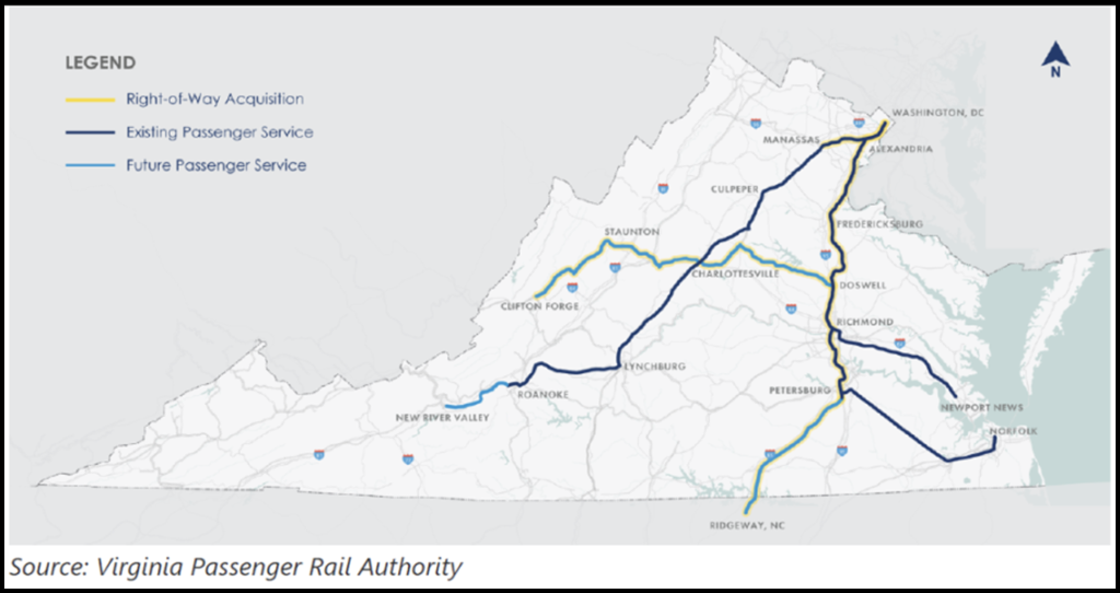 The goal of the initiative is to expand and improve passenger rail services across Virginia through track right-of-way acquisitions, rail infrastructure investments, and passenger service improvements (see map above). Eventually, it will separate freight and passenger rail services, improving the on-time performance of both. Once complete, VPRA is slated to fund a total of 13 daily Amtrak roundtrips, up from the current eight, along four corridors between Washington, D.C. and Roanoke, Newport News, Norfolk, and Richmond, Va.