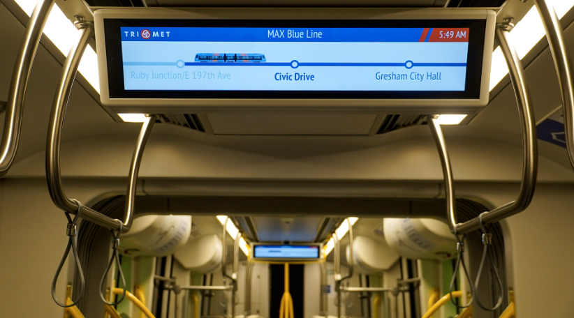 “On the outside, the newest MAX trains look similar to our last generation of vehicles, the ‘Type 5,’ introduced in 2015 when the MAX Orange Line opened,” TriMet reported. “Both are manufactured by Siemens Mobility. They’re the same length—96 feet, 11 inches—and the same width—8 feet, 8 inches.  They’re also both blue with orange stripes. But look closely on the inside, and it’s a different story. On the ceiling are digital destination displays (pictured, top), enhanced by graphics and video. They not only show the station the train is approaching, but also are capable of displaying special messages and video packages. By using improved accessibility features, riders will have more information available to them as they ride. New LED lights around the doors indicate when they’re available. The lights will display in green when a door is ready for use, red when it’s closed and cannot be used, and flash yellow when the doors are operating to provide better visual aids for riders. Improved temperature controls will help the trains stay cooler in the summer and warmer in the winter. One thing riders may not notice—at least not at first—is the ability to use predictive maintenance to improve the trains’ reliability. Sensors in the trains will communicate digitally with our maintenance teams, giving them better information to troubleshoot and solve issues before they occur. On board security cameras are better, too. They will provide clearer pictures and feature wireless data for remote downloading of footage.”