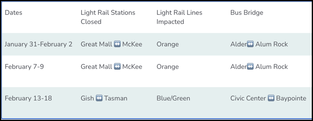 In January and February, VTA will be installing new elements of the track and signal system between the Alder and Alum Rock Stations. The first shutdown for this project (Jan. 31-Feb. 2) will focus on track and signal work near the Capitol Ave/Autmnvale Dr grade crossing north of the Cropley Station. The second shutdown for the project (Feb. 7-9) will focus on track and signal work near the Capitol Ave/Hostetter Rd grade crossing north of the Hostetter Station.