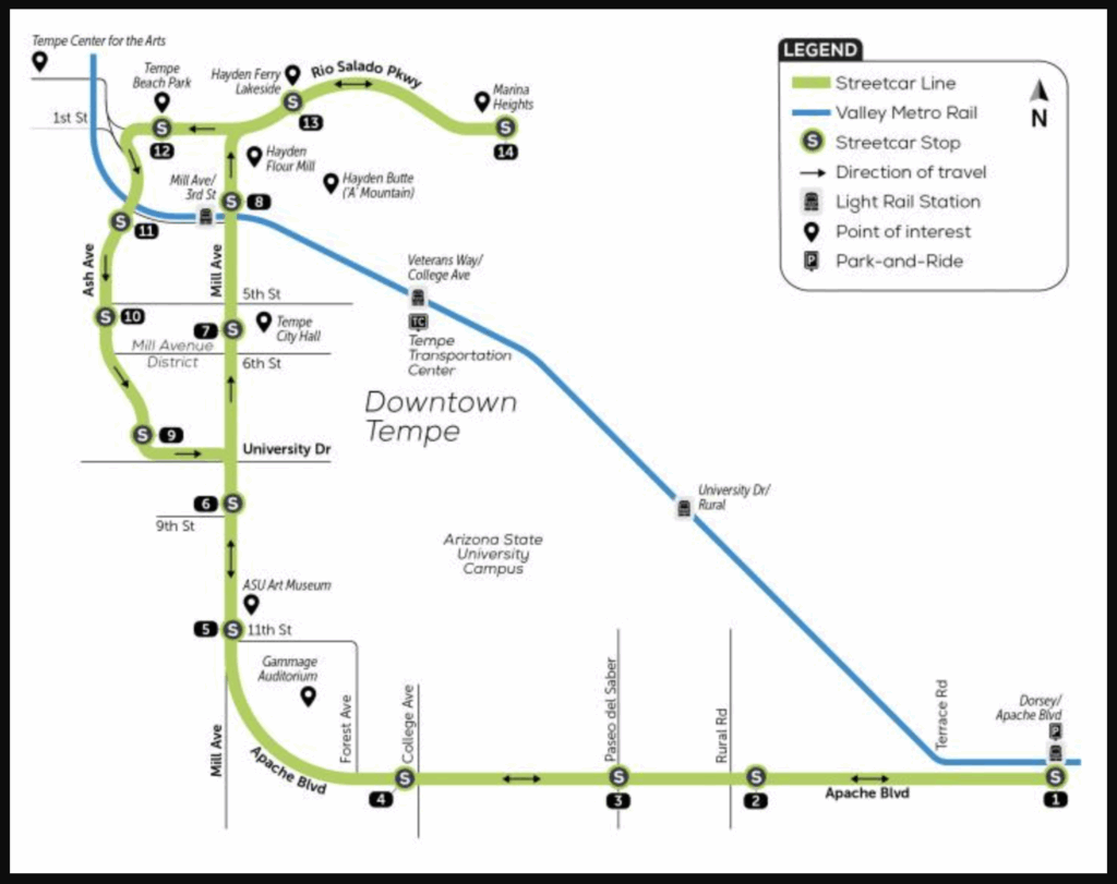 Valley Metro in 2024 was awarded a $16 million RAISE grant from the U.S. Department of Transportation for the Rio East-Dobson Streetcar Study. The 4.4-mile extension—from Rio Salado Parkway and Marina Heights in Tempe to Dobson Road in Mesa and south on Dobson Road to Main Street—would build on the success of the streetcar system, which opened in 2022.