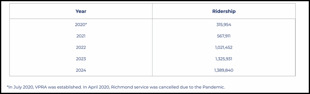 - “Amtrak Virginia Record Ridership: Under VPRA’s guidance, Amtrak Virginia set a ridership record during calendar year 2024 with 1.389 million passengers traveling. In addition, December 2024 marked the highest monthly ridership for Amtrak Virginia–136,433—since the launch of state-supported service in 2009. These increases occurred along all four corridors with three roundtrips between Norfolk and Washington, D.C., two between both Roanoke and Washington, and Newport News and Washington, and one between Richmond and the nation’s capital. The service offers a one-seat ride from Virginia to Philadelphia, New York, and Boston, as well as intermediate stops on Amtrak’s Northeast Corridor.”