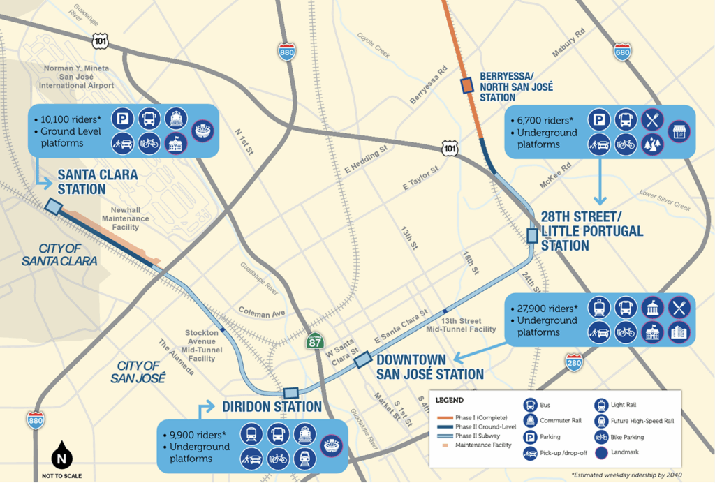 The six-mile extension project—which includes three underground stations (28th Street/Little Portugal, Downtown San José, and Diridon), one at-grade station (Santa Clara), a maintenance facility, and five miles of subway tunnel—will expand BART service from the Berryessa Transit Center in northeast San José through downtown San José into the city of Santa Clara (see map below). VTA is the funding agency and will manage the delivery of the project, while BART is system operator and maintainer. (The 10-mile BART Phase I Berryessa Extension opened in 2020; it begins south of BART’s Warm Springs Station in Fremont, proceeds through Milpitas and ends in the Berryessa area of north San José.)