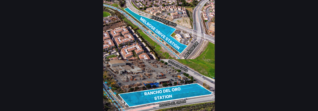 The Board’s approval, NCTD says, “marks a critical step toward reinventing the two existing SPRINTER stations at Melrose Avenue and Rancho Del Oro Avenue, aiming to transform them from underutilized parking lots into vibrant community spaces where residents and visitors can live, shop and play.”
