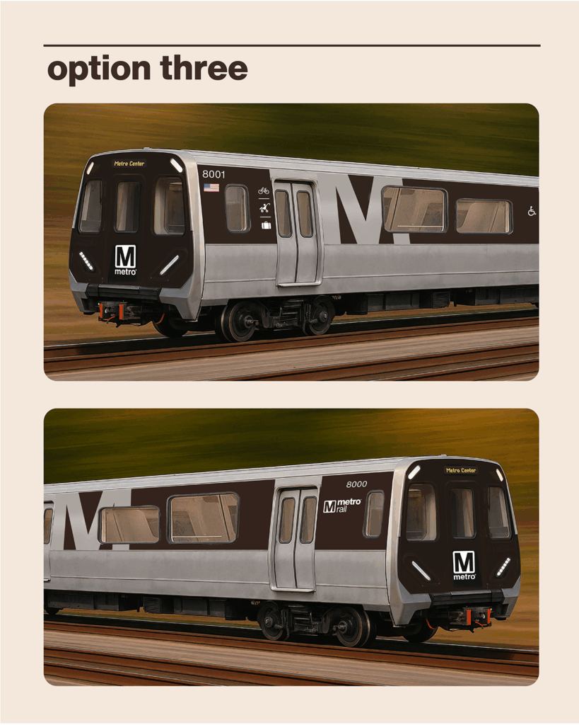 Voting for one of three design options (see below) will close at 11:59 p.m. ET on Friday, Aug. 22. The winning concept will be announced the following week. (Metropolitan Atlanta Rapid Transit Authority in 2021 similarly asked the public to weigh in on the exterior graphic design for its 254 new Stadler railcars. It revealed the winner in 2022.)