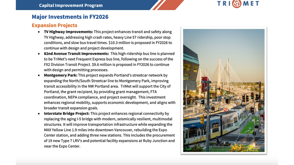 Capital investments are expected to cover the 82nd Avenue Transit Project, development of the Columbus Bus Base site, electric bus purchases and related charging infrastructure, and transit center expansions. Other projects include “regular replacements of equipment, track and signal infrastructure, and safety elements across the system,” according to TriMet.