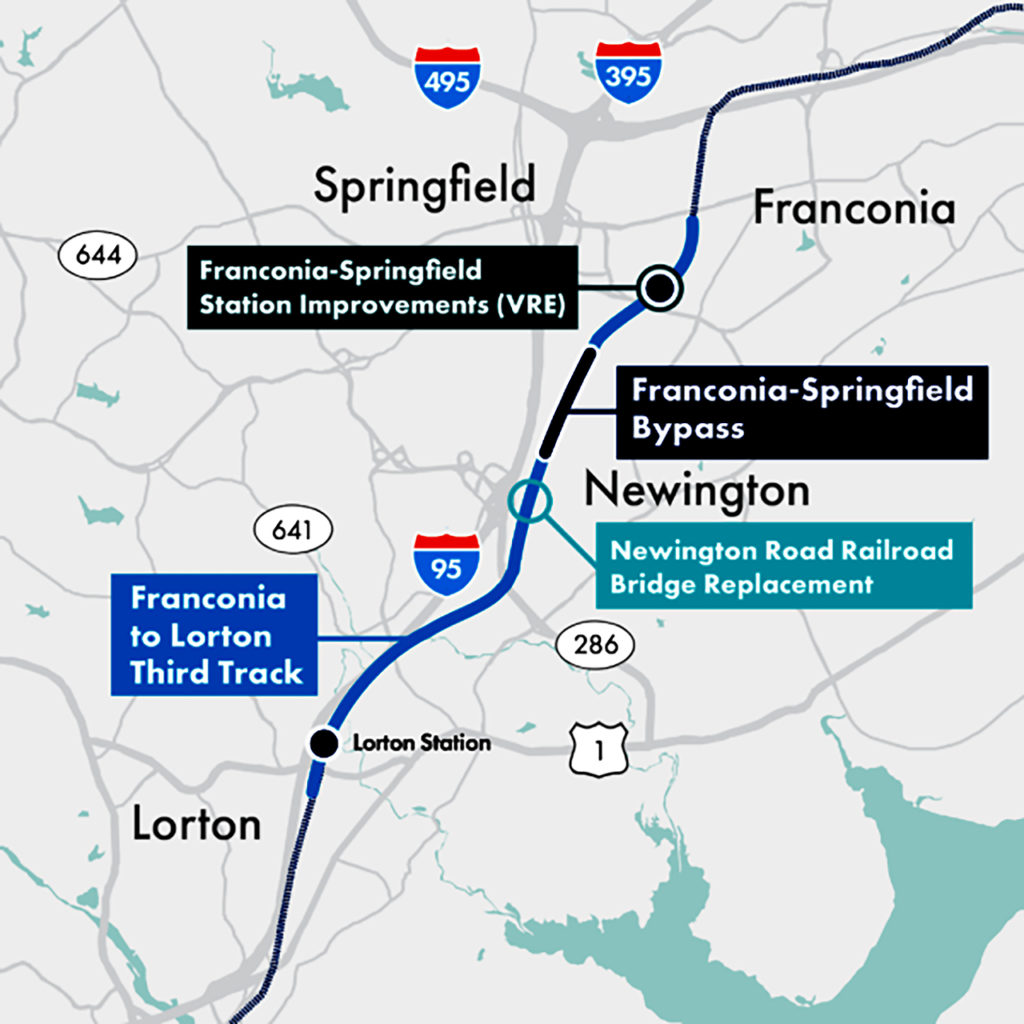 The VPRA (Virginia Passenger Rail Authority) $275 million Franconia to Lorton Third Track project will add approximately six miles of main line third track from Franconia to Lorton, creating a continuous triple-track corridor between Alexandria and Lorton. The work includes significant infrastructure modifications to accommodate increased rail capacity and operational efficiency. Key components of the project include the realignment of existing tracks, replacing outdated sections and constructing new bridges over Newington Road and Lorton Road. Upgrades to the signaling and communication systems along the corridor will improve operational coordination. Drainage systems and other support infrastructure will also be upgraded to ensure the expanded system’s durability under varying weather conditions. The modifications will increase the line’s efficiency, reduce delays and improve the overall performance of the VRE (Virginia Railway Express) corridor. A construction start date for March of 2025 has been announced. The Franconia to Lorton Third Track Project will be coordinated with the Franconia-Springfield Bypass Project.