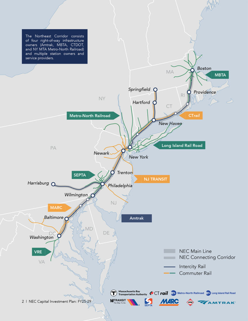 The NCC (Northeast Corridor Commission) 2025-2029 CIP (Capital Investment Plan) consists of billions of dollars in critical infrastructure projects. “In FY25, NEC agencies plan to invest $6.4 billion to advance 90 programs and 253 projects, continuing the trend of increasing planned spend year-over-year since BIL,” the NCC notes (download below). “97 of those projects are scheduled to be in construction and 35 projects will be completed within FY25, including Next Generation Acela upgrades, Windsor Locks station in Connecticut, and Frazer Rail Shop and Yard in Pennsylvania. Of the $6.4 billion planned expenditure in FY25, project sponsors plan to spend approximately $2.6 billion on major backlog project activities across the NEC including construction on the Connecticut River Bridge Replacement and Frederick Douglass Tunnel projects.”