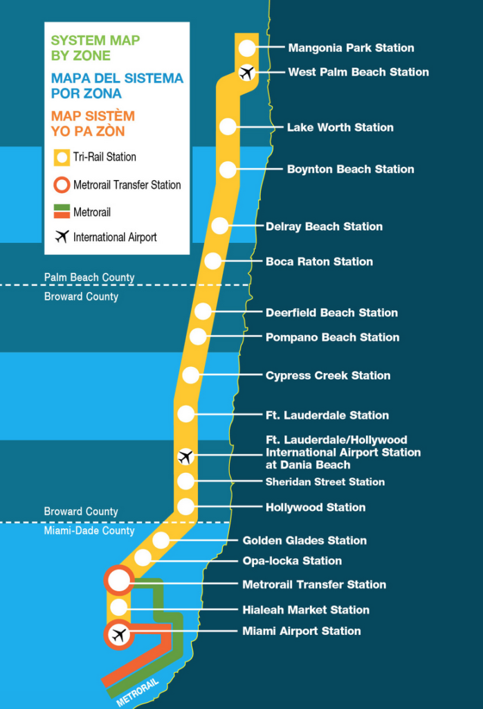 Tri-Rail operates on the historic Seaboard Railroad, several miles west (inland) from the historic Florida East Coast Railway (FEC) alignment that goes through Miami and other downtown areas, and which Brightline uses. At the present time, Metro Rail, the elevated line operated by Miami-Dade Transit, provides the link between Tri-Rail and downtown Miami. There is a transfer station in Hialeah, at 79th Street, two stops north of Tri-Rail’s southern terminal at Miami International Airport.