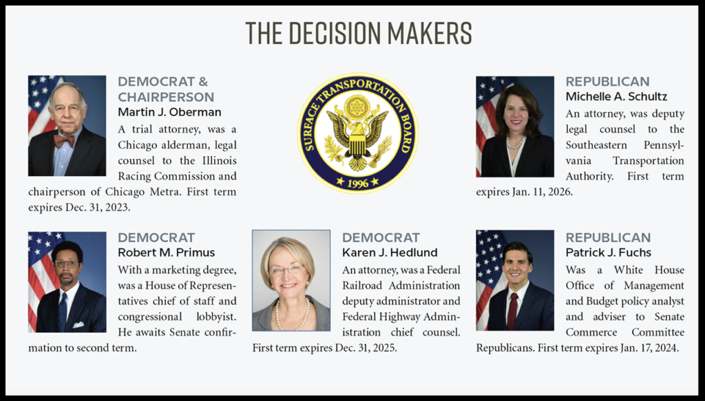 Guiding—through control of the docket—the five-member STB is 77-year-old President Biden-designated Chairperson Martin J. Oberman, seeking a fourth public legacy. He already is celebrated as a Chicago Democratic alderman who bucked and then survived, through re-election, the Democratic political machine. Earlier, as general counsel to the Illinois Racing Commission, and later as chairperson of commuter rail system Chicago Metra, Oberman earned plaudits for purging improper conduct.
