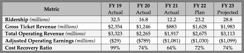 • Ridership grew to 12.2 million customer trips, 42% above what Amtrak projected in its plan, “but still far below ridership levels before the COVID-19 pandemic.”