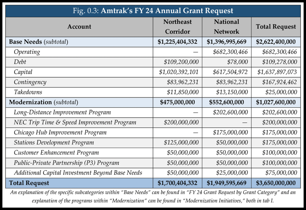 To give Congress “the most transparent and helpful view of Amtrak’s needs and of where federal investment can be applied,” he said, the railroad has broken down its FY24 grant request into “base needs” and “modernization.”
