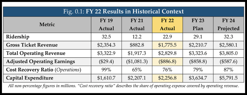 Despite this, ridership and operating revenues were “outmatched by the strong headwinds of rising costs, which meant substantial operating losses remained,” Gardner reported. “In particular, operating costs increased as we returned services across our network while high-value Northeast Corridor (NEC) business travel was slow to recover, which had an outsized effect on our revenues.” Additionally, Gardner said, “to support a historic increase in the number and size of capital projects now being advanced with IIJA funding, the company began a multi-year increase in investments associated with hiring and training, financial controls, and other company-wide needs, which is adversely impacting our adjusted operating earnings.” He said this was on top of “general inflationary pressures that adversely affected many aspects of Amtrak’s business in FY22: the company’s costs per available seat-mile rose by more than 15% from FY19 levels.”