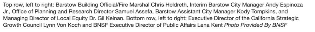 BNSF’s BIG team and Barstow city officials met with leadership from California’s Labor/Workforce Development, State Treasurer, Office of Planning and Research and Strategic Growth Council, State Transportation Authority, Department of Consumer Affairs and Housing and Workforce Development Board offices to relay some common sense. Following the meeting, Barstow Interim City Manager Andrew Espinoza Jr. said that the response from state officials was “overwhelmingly positive” … the group “gained a number of allies for our fight,” and that the battle with CARB is “not completely over but we are gaining ground“ and ”moving full speed ahead with this project.”