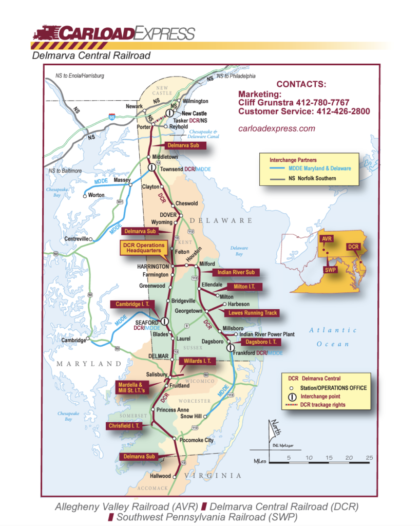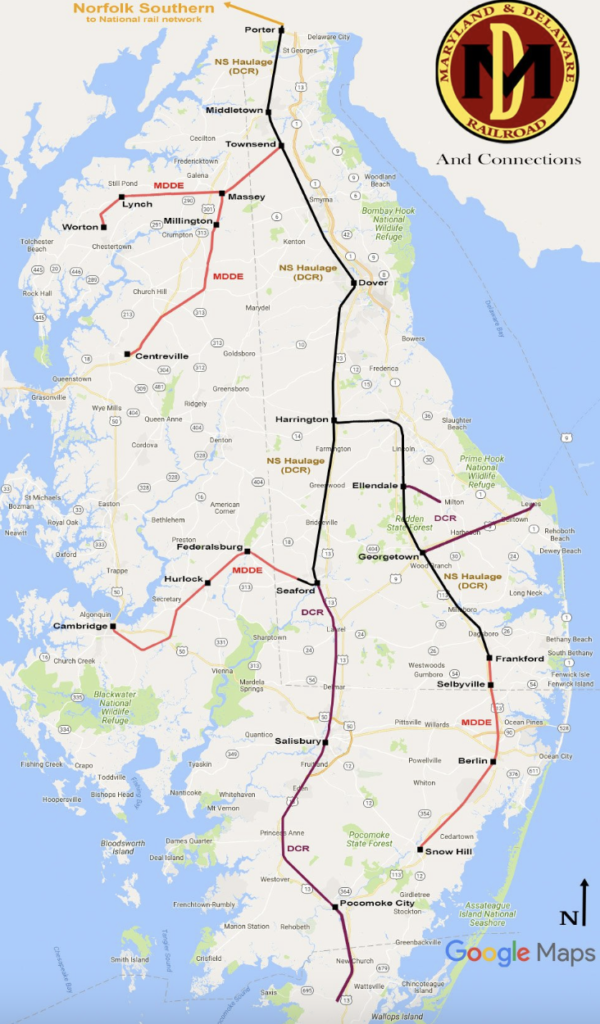 Class III MDDE interchanges with Norfolk Southern (NS) and operates three unconnected rail lines (see above) between Delaware and Maryland:
