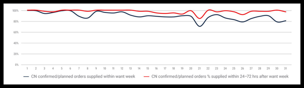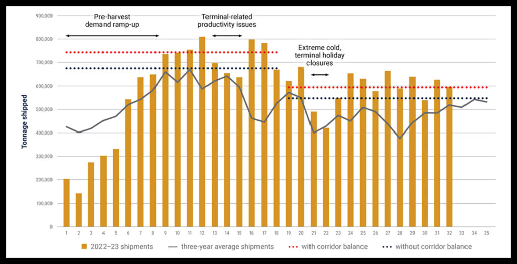 CN offers two grain reports: a weekly Western Canadian Grain Report, produced since the 2016-17 crop year, and a monthly Grain Plan update. Both summarize the major events affecting the supply chain. “Unlike industry and government data, these reports get into the ‘why’ of what’s going on in the supply chain,” CN says. “Our reporting includes a dashboard (below) to illustrate how the end-to-end supply chain is doing and ties it back to all the conditions required to achieve the maximum supply chain capacity described in our Grain Plan. Detail is also included as to the underlying cause of good or bad performance for each of the supply chain components. If you don’t have all the ingredients in place to bake the cake, so to speak, maximum end-to-end supply chain capacity cannot be consistently achieved.”