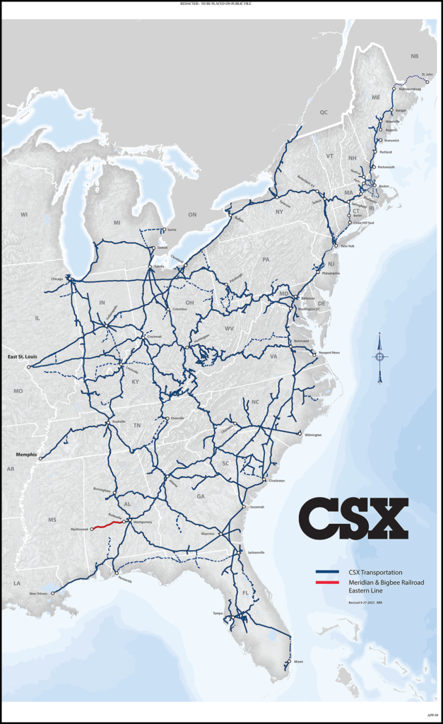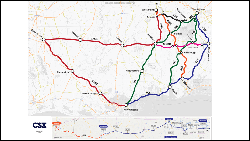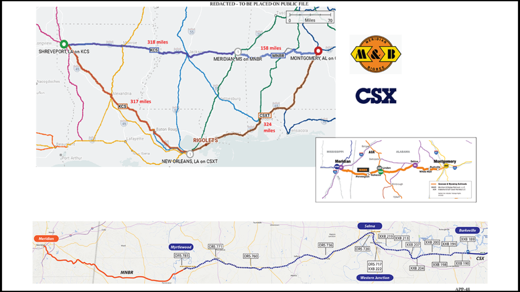 MNBR currently operates approximately 168 miles of single track main line between Meridian and Montgomery, and owns the approximately 50.4 route miles of track between Meridian and Myrtlewood. MNBR leases from CSXT the land underlying its approximately 107-mile rail line between Myrtlewood and Burkville. MNBR operates the approximately 10 miles between Burkville and Montgomery via incidental overhead trackage rights over CSXT. At Meridian, MNBR interchanges with CPKC and Norfolk Southern. At Myrtlewood, MNBR interchanges with AGR. On the Eastern Line, MNBR interchanges with NS at Selma and CSXT at Montgomery. As a result of CSXT’s transaction, MNBR will interchange with AGR and CSXT at Myrtlewood.