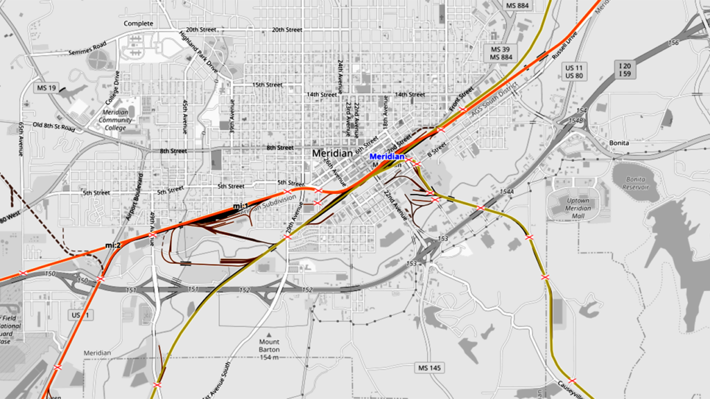 Trackage and connections in Meridian. OpenRailwayMap.org
