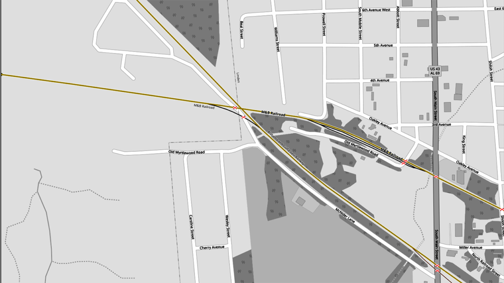 MNBR connection with AGR in Linden, Ala. OpenRailwayMap.org