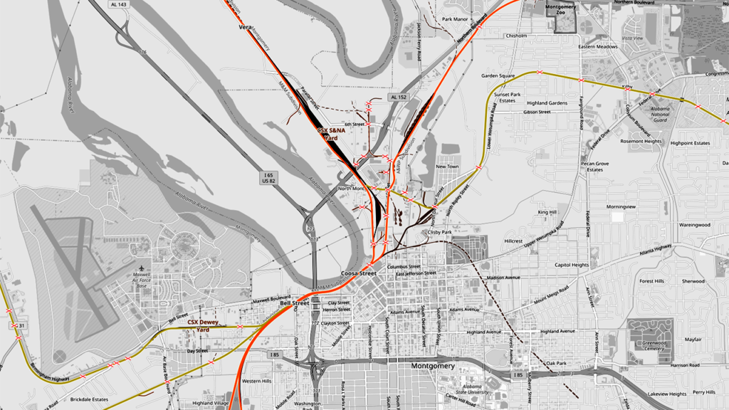 CSX trackage in Montgomery, Ala. MNBR connects with CSX at lower left. OpenRailwayMap.org