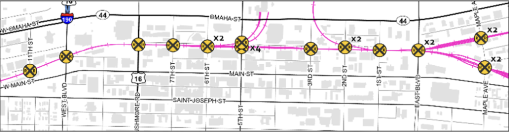 - South Dakota: City of Rapid City’s Comprehensive Downtown Railroad Safety Solutions project—The City will receive $1.1 million to plan and design safety improvements for at-grade rail crossings in the downtown area. Project activities will potentially include a feasibility study, NEPA analysis, benefit-cost analysis, right-of-way survey, engineering design, and public engagement, according to USDOT, which noted that the project deliverables “will align with the City’s plans already being developed through a Safe Streets for All (SS4A) planning grant that Rapid City was awarded in 2023.” USDOT reported that “quality of life will be addressed by integrating rail crossing improvements with affordable housing and mixed-use economic development efforts,” and “mobility and community connectivity will be addressed by the creation of alternate routes around the tracks given trains can create gridlock, and in the event of a stalled train or accident, can cut the city in half.” Crossings will be made ADA compliant, with sidewalk connections.