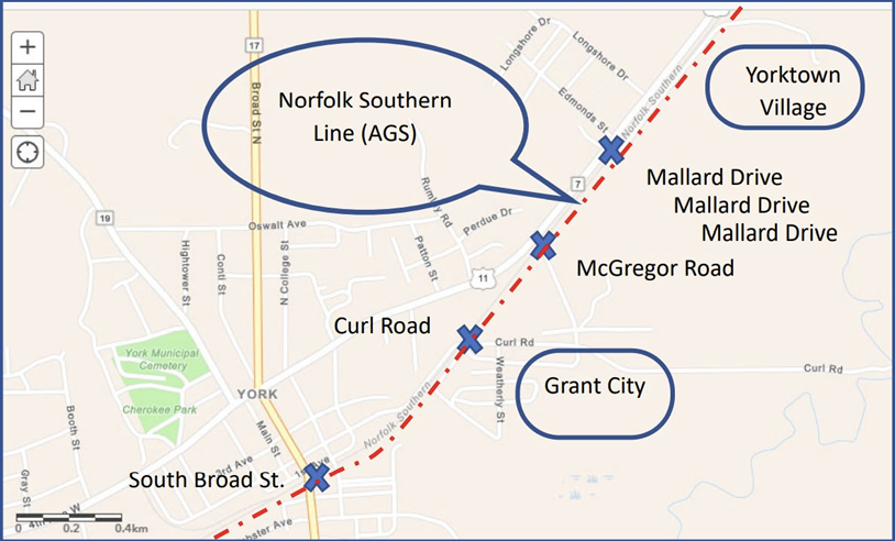 - Alabama: City of York’s Raise York Study—The City will receive $3 million to plan and design improvements at highway/rail grade crossings due to stopped and idling freight and passenger trains along Norfolk Southern’s AGS South District, which also hosts Amtrak’s Crescent service. According to USDOT, the plan will provide “recommended improvements to the multimodal freight corridor, including those that seek to reduce conflicts with residential areas, as well as with passing and non-motorized traffic.” The agency noted that the project “will conduct the planning to increase connectivity for residents, reduce dangerous at-grade rail crossings, and reduce railway blockages that currently create landlocked neighborhoods when trains pass along NS’s sidings.” The planning process is slated to “quantify and recommend new alignments to reduce the amount of unnecessary idling that occurs during the blockages of cars and trucks and contributes to transportation air pollution and greenhouse gas emissions.”