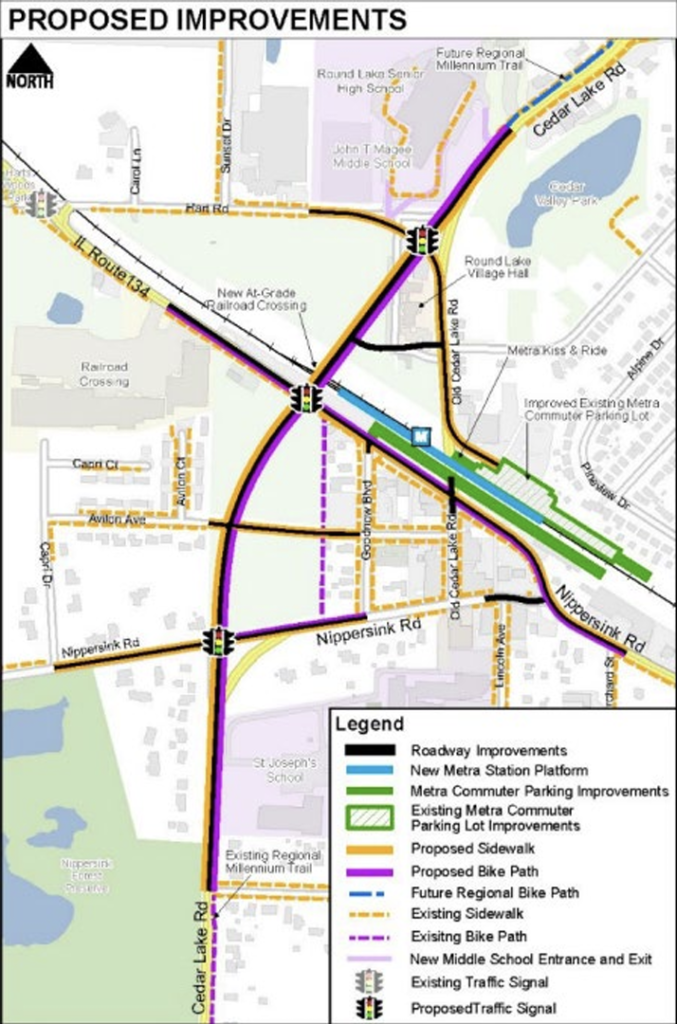 - Illinois: City of Lake County’s Cedar Lake Road Realignment and Mobility Improvement Project—The City will receive $18.8 million to construct a new alignment for Cedar Lake Road from Hart Road to Nippersink Road. The project will also include approximately five new intersections, ADA sidewalks, shared-use path, bicycle path, sidewalks, and pedestrian crossings. Additionally, the project will update the Round Lake Metra Station with a platform extension and improvements, consolidation of commuter parking, warming shelters, bus stop shelters, and kiss and ride facilities on each side of the commuter railroad tracks. USDOT said that redirecting regional passthrough traffic via the new alignment west of the downtown area will reduce the frequency of crashes and the number of injury crashes to increase overall safety, and transit station improvement and added active transportation facilities “will increase affordable transportation choices and mobility and reduce greenhouse gas emissions through modal shift.”