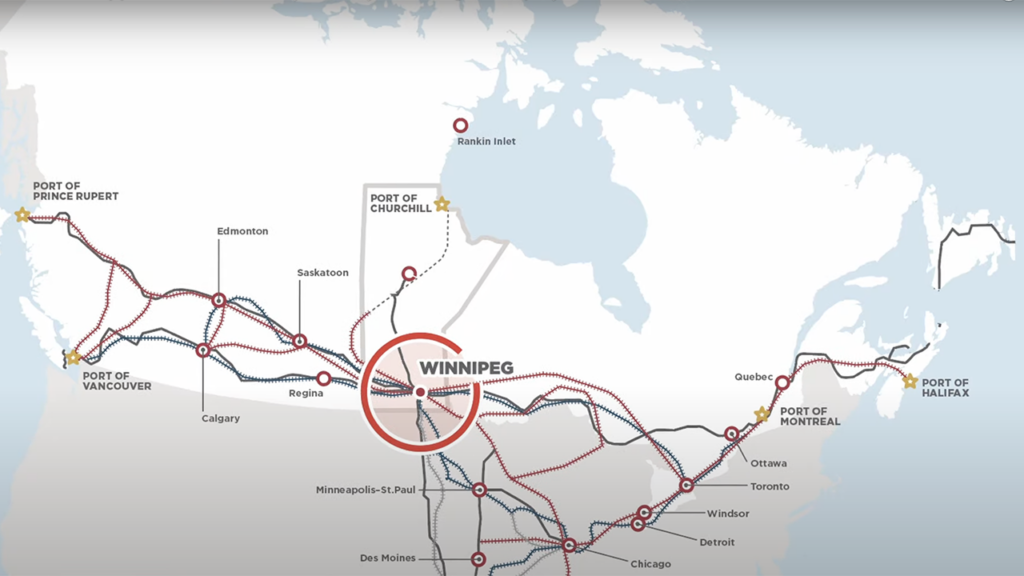 The 627-mile HBRY that connects with CN in The Pas, running north through Manitoba to the Hudson Bay at the Port of Churchill. (Screen Grab from a Prairies Economic Development Canada Video)