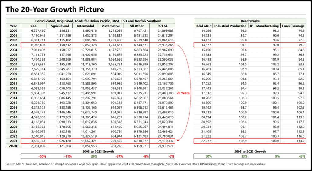 Providing testimony to the STB on behalf of Loop Capital was Rick Paterson, who has been a Wall Street analyst covering the railroads for 24 years. He presented consolidated, annual volumes for Union Pacific, BNSF, CSX, and Norfolk Southern back to 2000. “[I]f we focus on the 20-year track record, between 2003 and 2023, it’s a depressing picture,” he reported (see charts below). “Coal is now less than half of 2003 levels. Agricultural products are 11% lower. Intermodal is the bright spot, up 29% over the last 20 years. Automotive has crashed by 37% as the rail-heavy Big 3 U.S. automakers have struggled. All other commodities are down 8%. If you put it all together, the four major railroads hauled 7% fewer loads last year than they did in 2003.