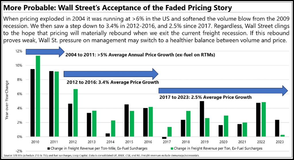 • “Scenario 3 is, I think, how this ultimately plays out. In this scenario the Wall Street pressure points do change. After the 3.7-to-1 outperformance of the stocks over the last 20 years, there’s an understandable reluctance to believe the rail pricing story is over. But it is. The glory days were 2004 through 2011, when annual price growth exceeded 5%. That throttled back to 3.4% between 2012 and 2016 and decelerated again to just 2.5% from 2017 through the present. With the recent exception of intermodal, we’ve been in a freight recession for two years now, and the last piece of Wall Street hope is that when demand strengthens we’ll see a significant increase in rail pricing. If that proves underwhelming, which I think it will, that might be the last straw when Wall Street finally accepts the end of the pricing story, and pressure on management will rebalance into a healthier mix of volume and price. You’ll know when we reach that point, because someone will get on a quarterly earnings call and ask railroad management a question that goes something like this: ‘We all know the rail pricing story is over, so what are you doing to grow volumes?’”