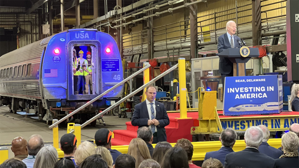 President Joe Biden shared the news about the $16.4 billion NEC investment from his home state of Delaware, at the Amtrak Bear Maintenance Facility. (Photograph Courtesy of Delaware Gov. John Carney, via X, formerly known as Twitter)