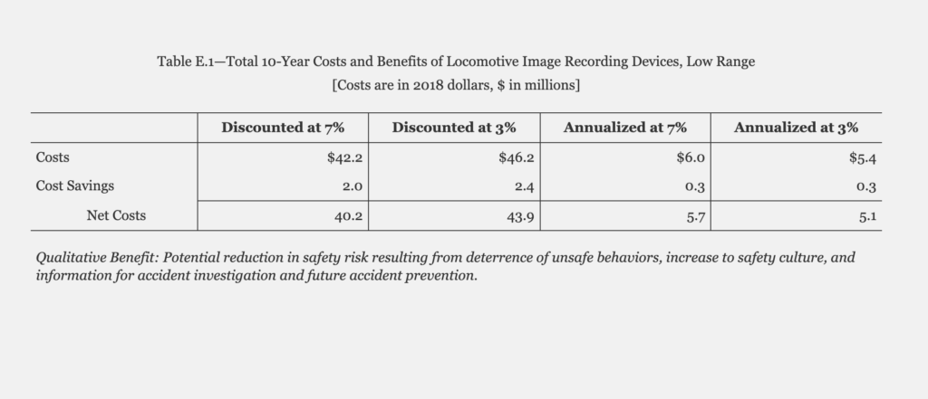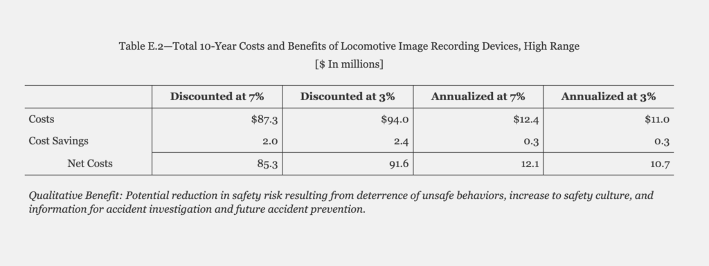 The primary source of expected benefits, FRA says, is the potential reduction in safety risk. FRA conducted a literature review to determine the effectiveness rate of inward- and outward-facing recording devices but “was unable to determine an appropriate rate.”